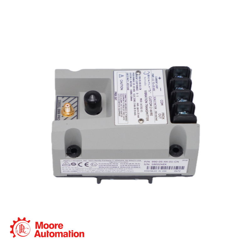 The 990-04-XX-02-05 MOD:167577-05 vibration transmitter is a 2-wire, loop-powered device that accepts input from Bently Nevada's 3300 NSv proximity probes and a matching extension cable (available in 5 m and 7 m system length options). The transmitter conditions the signal into appropriate peak-to-peak vibration amplitude engineering units, and provides this value as a proportional 4 to 20 mA industry-standard signal as the input to the control system where machinery protection alarming occurs.