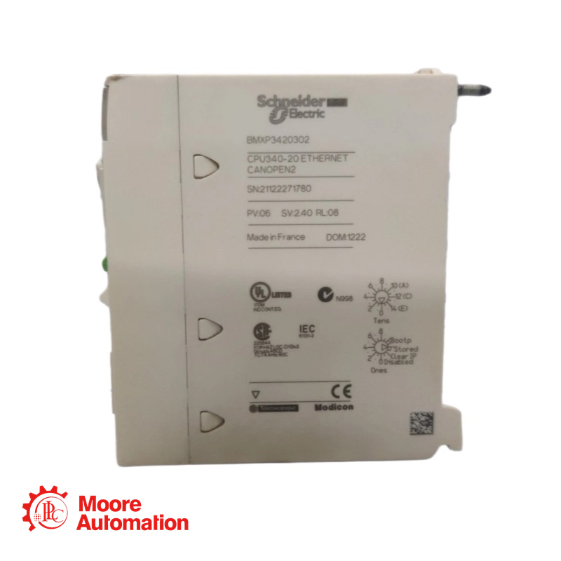 This BMXP3420302 processor module is part of the Modicon M340 range, an offer of Programmable Automation Controllers (PAC). It offers a maximum of 4 rack configuration, 36 application specific channels, 63 CANopen slaves and 11 slots.